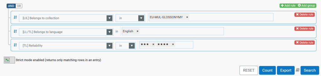 - Export based on a collection, containing only terms with reliability 3 and 4 in English – strict match.