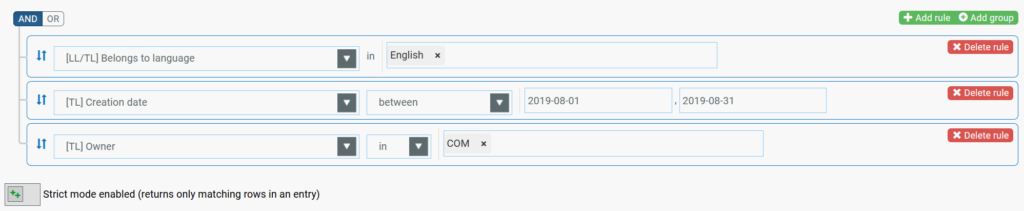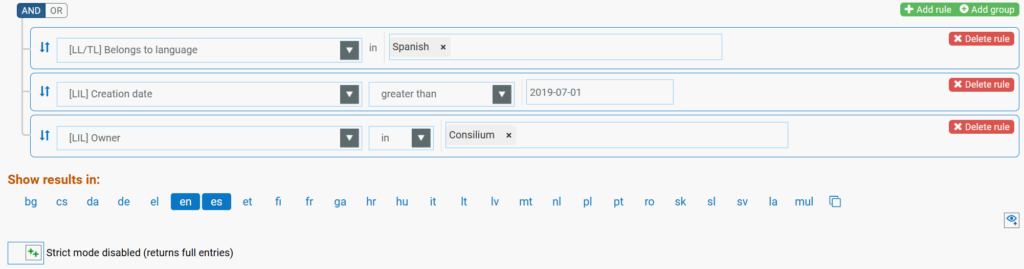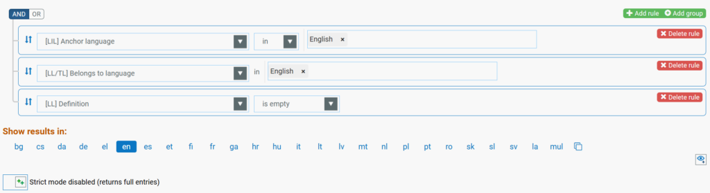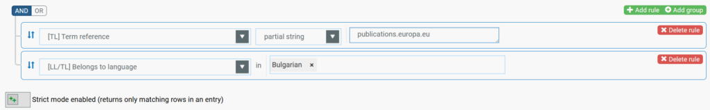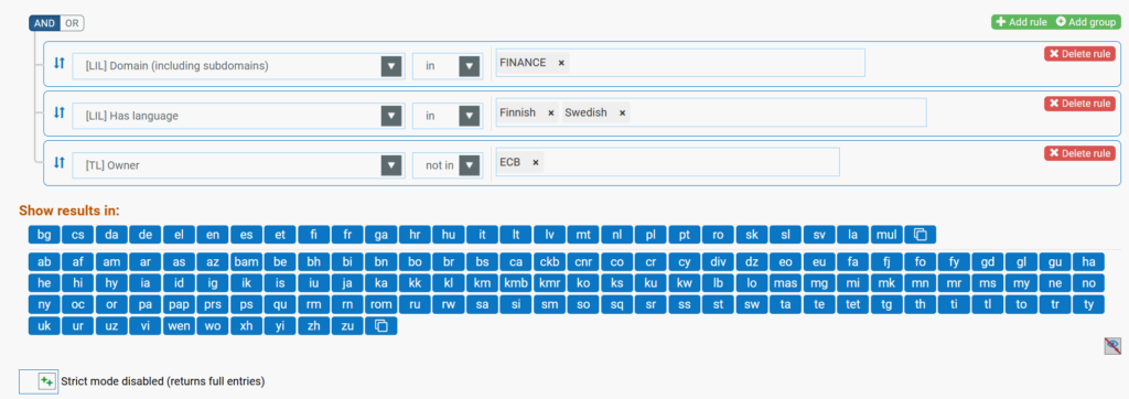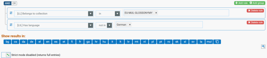 Whenever you search for something in LL or TL, specify the language with the rule ‘LL/TL Belongs to language’. If you don’t use this rule, the search is targeted to all EU languages (non-EU languages are excluded to optimise the query).