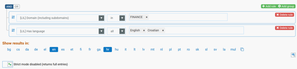 - Entries in a certain domain containing both EN and HR. Visualisation limited to those languages.