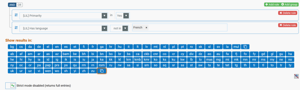 - Primary entries where a particular language (FR) is missing. Visualisation of all available languages in the entry.