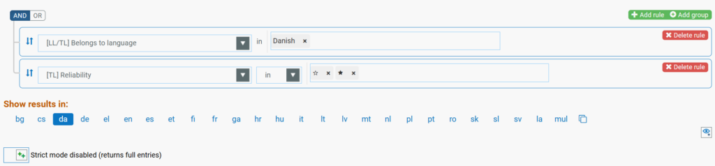 - Particular language (DA) TLs with reliability 1 or 2. Visualisation of Danish language (non-strict, all terms under DA will be displayed).